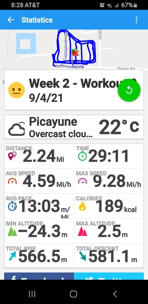 Well I got out the door and did my training. Although with the crews here cleaning up after Ida I almost went back in. They were all up and outside getting ready for work, which made the Campground to busy for my liking on my run. Either way I pushed myself harder and did the 29 minutes of running even with all the commotion outside while I did it.