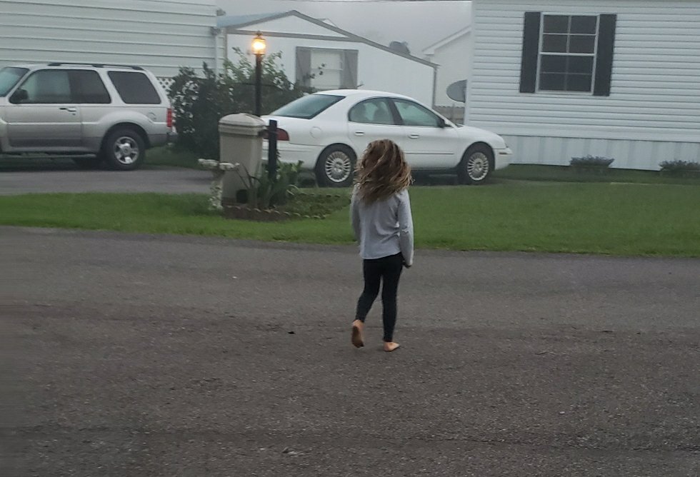 My youngest daughter woke up with me and went running. She does not have any running shoes at the moment, because she left them at our home state: So she went barefoot.