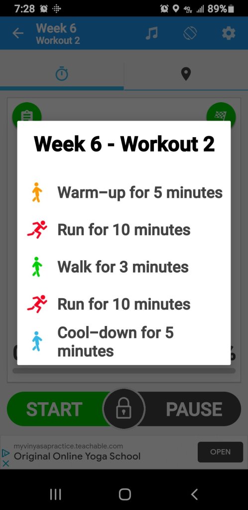 I was able to run for the first 10 minutes without wanting to quit and my breathing was on point. After three minutes of walking it was time to run for another 10. Maybe three quarters of the way through I stepped on a speed bump the wrong way and rolled my ankle a little. I walked it off for 30 seconds and completed the run. If it wasn’t for landing on my foot wrong I could have run a bit longer I enjoyed it that much.