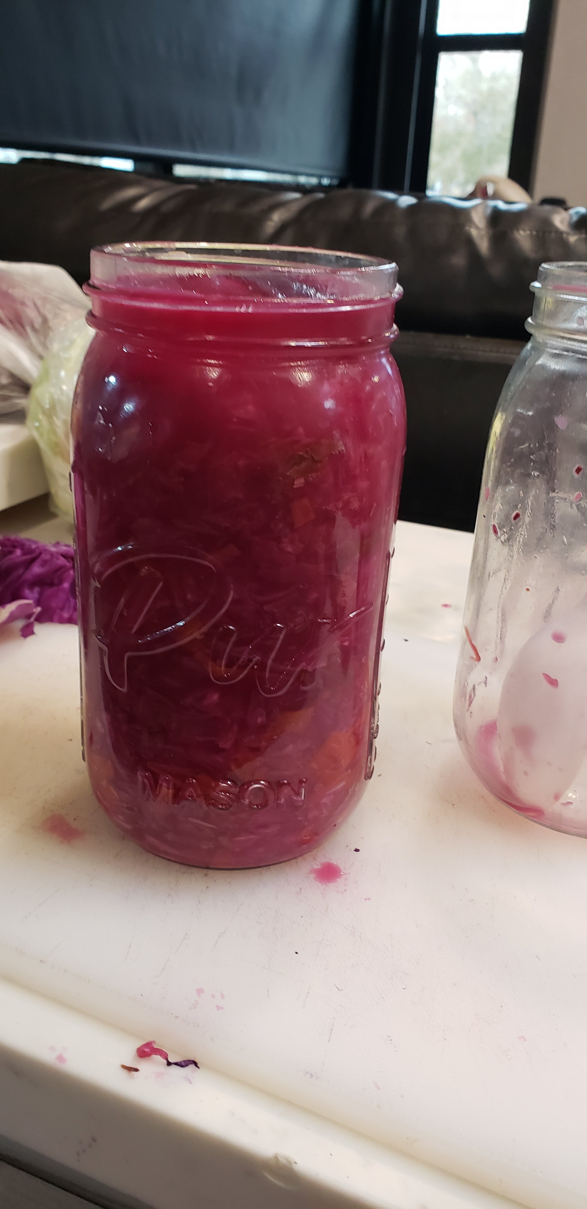 Three weeks ago I made some sour kraut for the first time! What I learned is even the the jar is full cram more in there! I pack it in way to loosely.