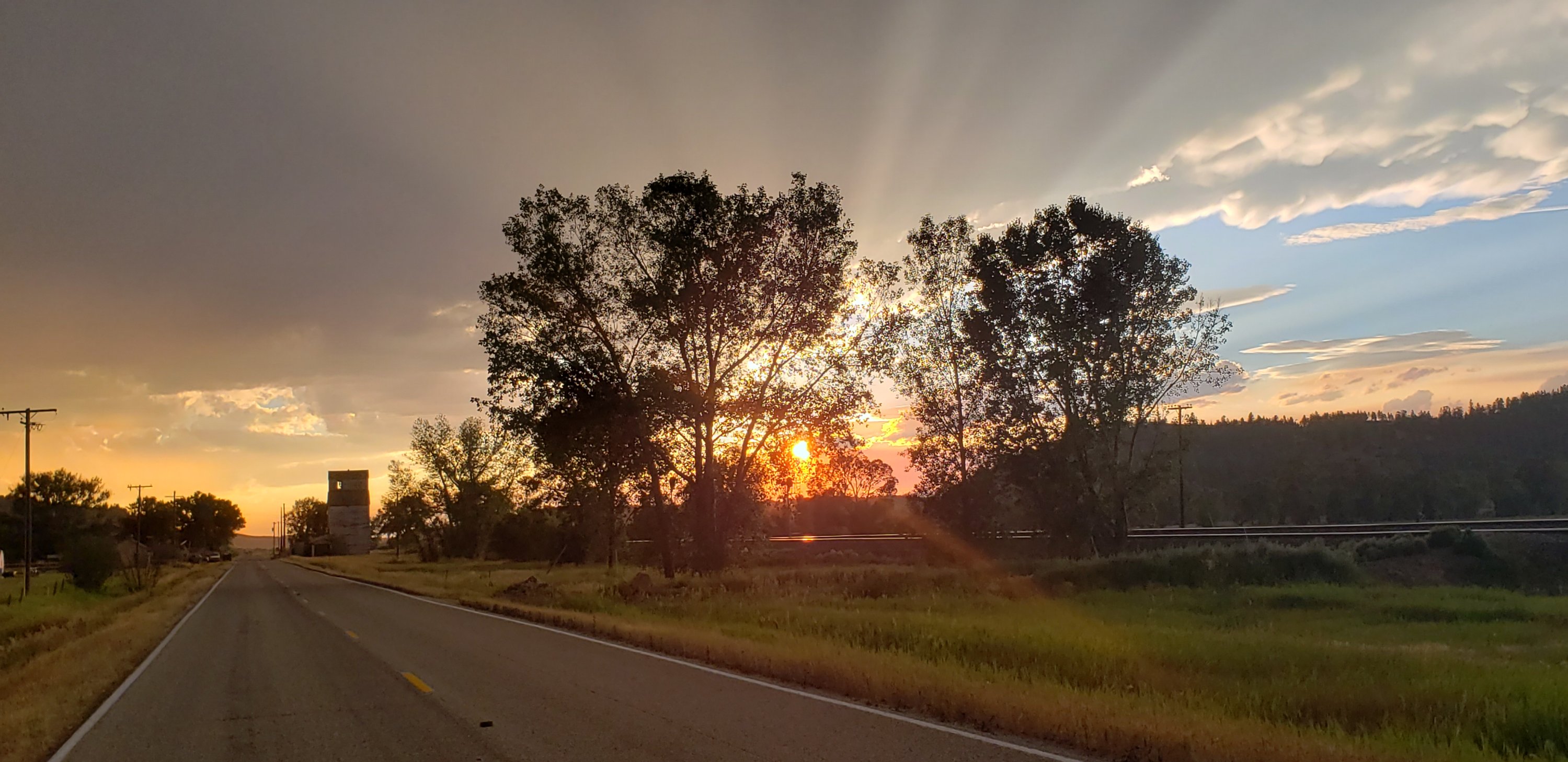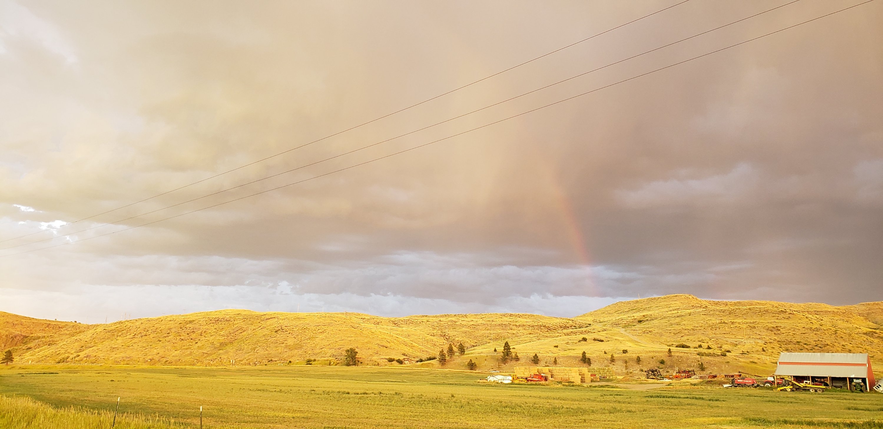 Wow what a walk! We got a show of lightning, thunder, wind, rainbows, and the setting sun. You can imagine the excitement in spotting the rainbow and being in Montana with no trees blocking where it ends what an amazing sight to behold. The clouds surrounding the sun were dark, ominous, and ready to burst from the sky. Luckily the wind did not pick up to hard until after we were closer to home. As soon as we shut the door the wind started howling around the camper.