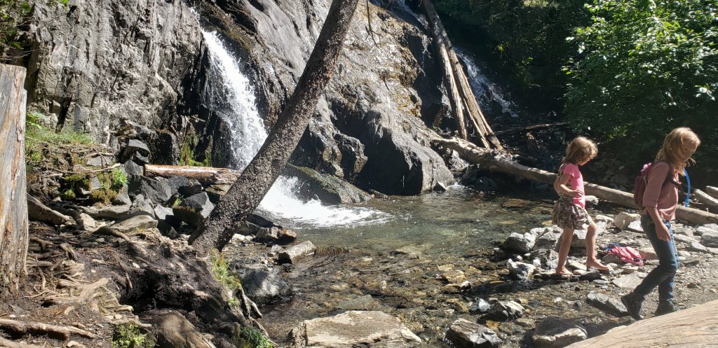 We made it to the falls and of course my youngest took her hiking boots off and Kamelback bag off. Needless to say we were a about a quarter of the way back to the parking lot when we realized her bag was left behind. So dad had to run all the way back up the trail and find the bag. Luckily the bag was still where she left it by the time he made it back. Since dad was no longer with us to hike back down to the parking lot the girls decided to walk slower.