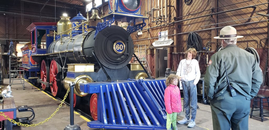 The girls received their junior ranger workbooks then we sat down and watched a 20-minute history lesson on railroads. Exiting the auditorium there was a little display that had power points on when the railroads met.