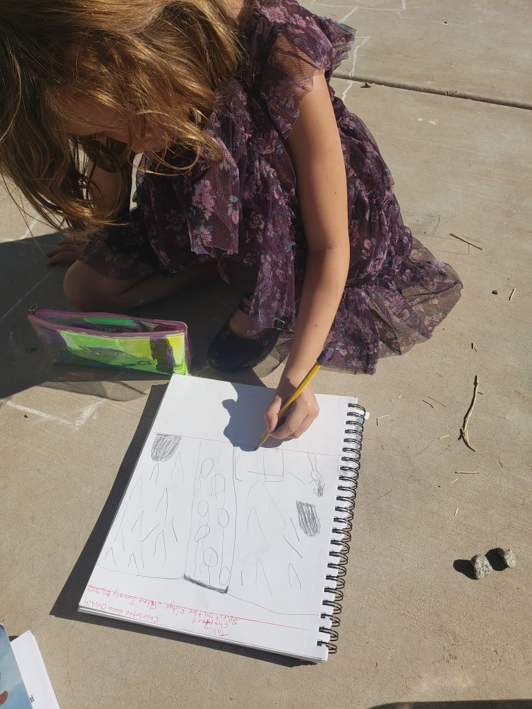 For history, we read a book called “Takini Lakota Boy Alerts Sitting Bull” by Kenneth Thomasma. We read a chapter a day and draw a picture of what happens in that chapter. When pictures are drawn and colored the girls tell me what they remember hearing from that chapter.