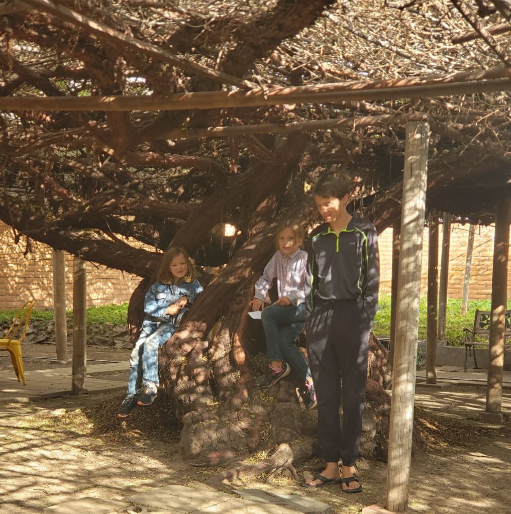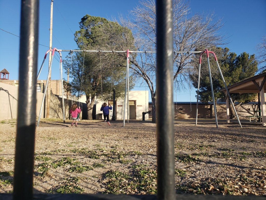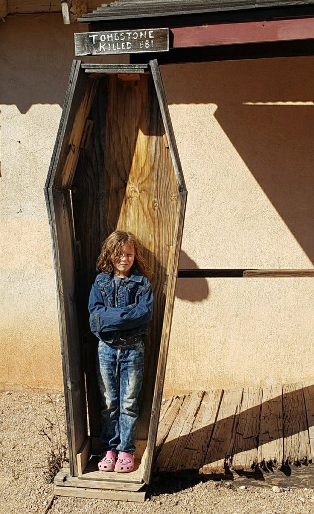 We left Yuma at 10:00 am on the 31st of January, it was a windy five-hour drive. When we finally arrived at Wells Fargo RV Park, the girls and I went in search of a playground. Luckily for us, there was a small park with swings right next door to the O.K. Corral. They swung for a little while then decided to take a stroll around a block to see what they could find.