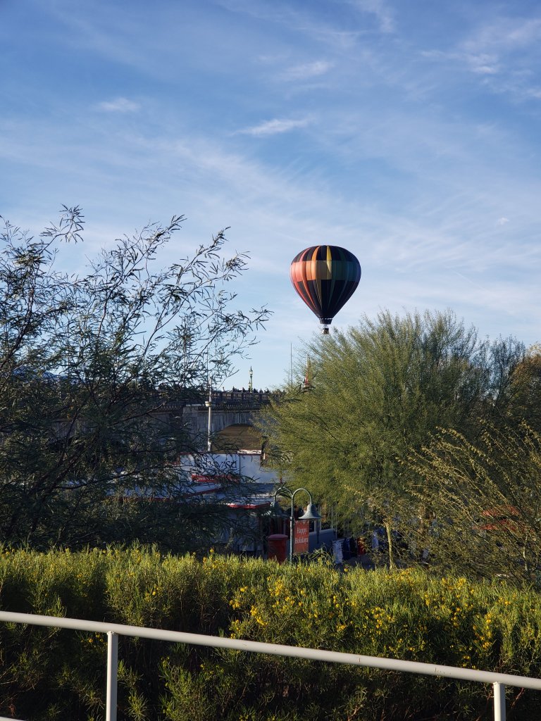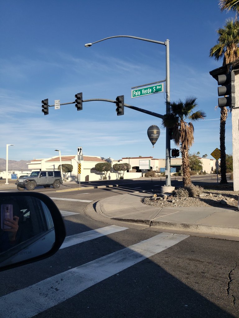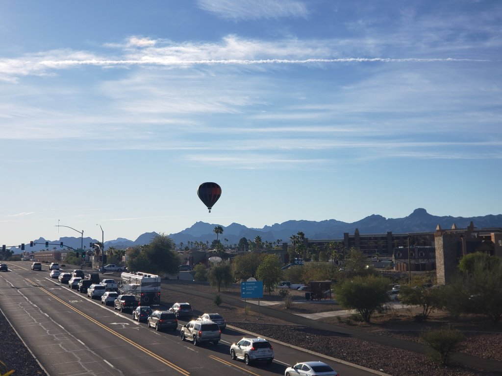 Once we arrived in Lake Havasu we found a spot to park and a restroom for me. Jer and the kids went ahead to find a good place to observe the influx of flying hot air balloons. After about an hour of not seeing all balloons in the air, we decided to take a ride around town and discovered them interspersed throughout the town. We were able to at least see a few take off from the ground. Below are a few pictures of our adventure.