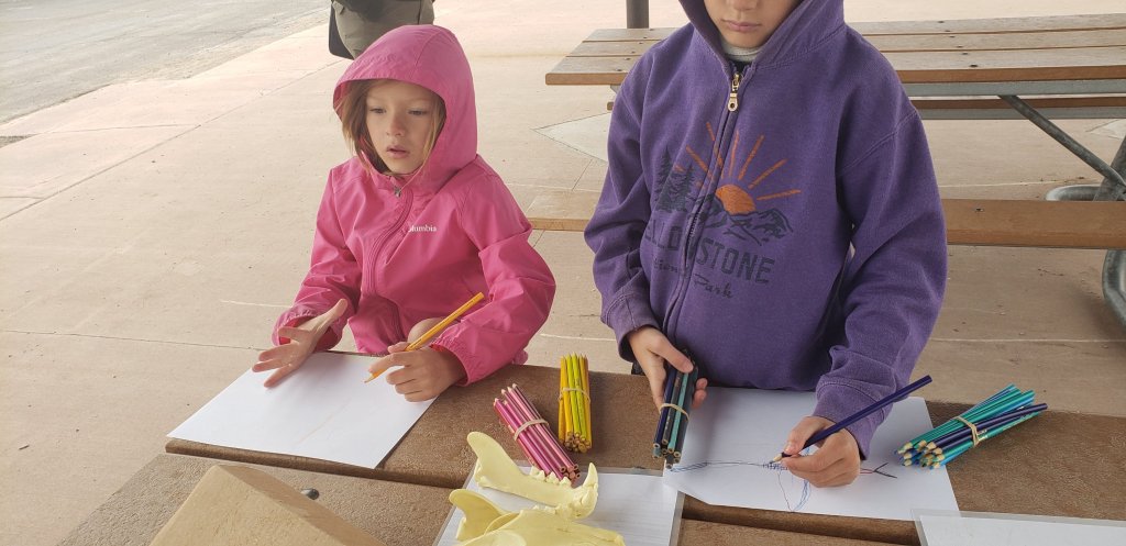 Ranger Megan taught us about paleo art. And how paleontologists drew what they thought the dinosaurs looked like based on how the fossils or skeletons looked. In the end, the ranger gave the kids colored pencils and white paper so they could make their drawings of what they thought the skeletons/fossils would have looked like with muscle and skin.