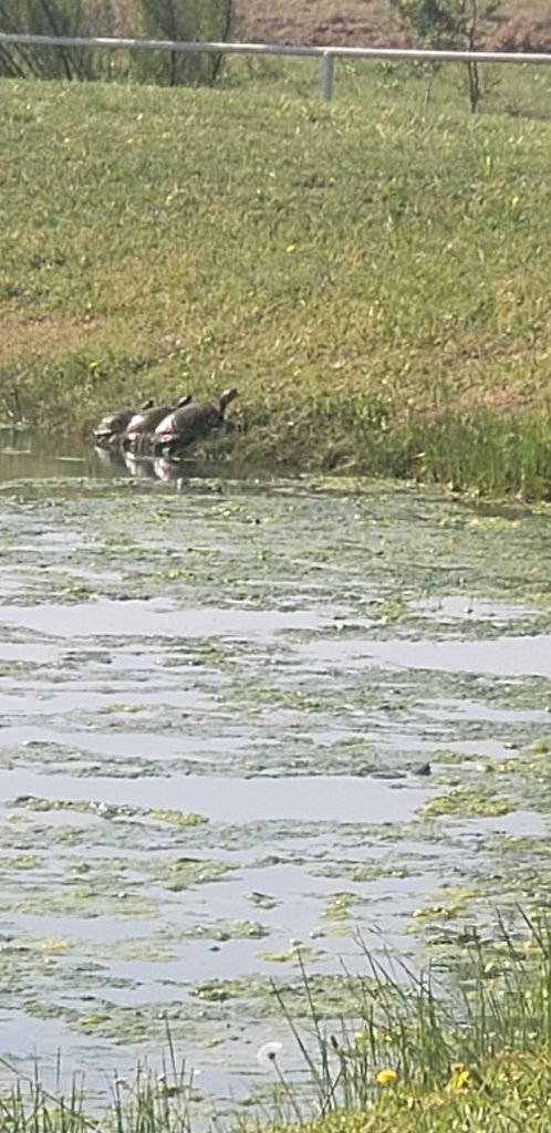 We went for a stroll this morning and found a bunch of turtles sunning themselves. Of course, being the age my kids are we scared them back into the water. Luckily there was a small bench halfway around the pond we were strolling.